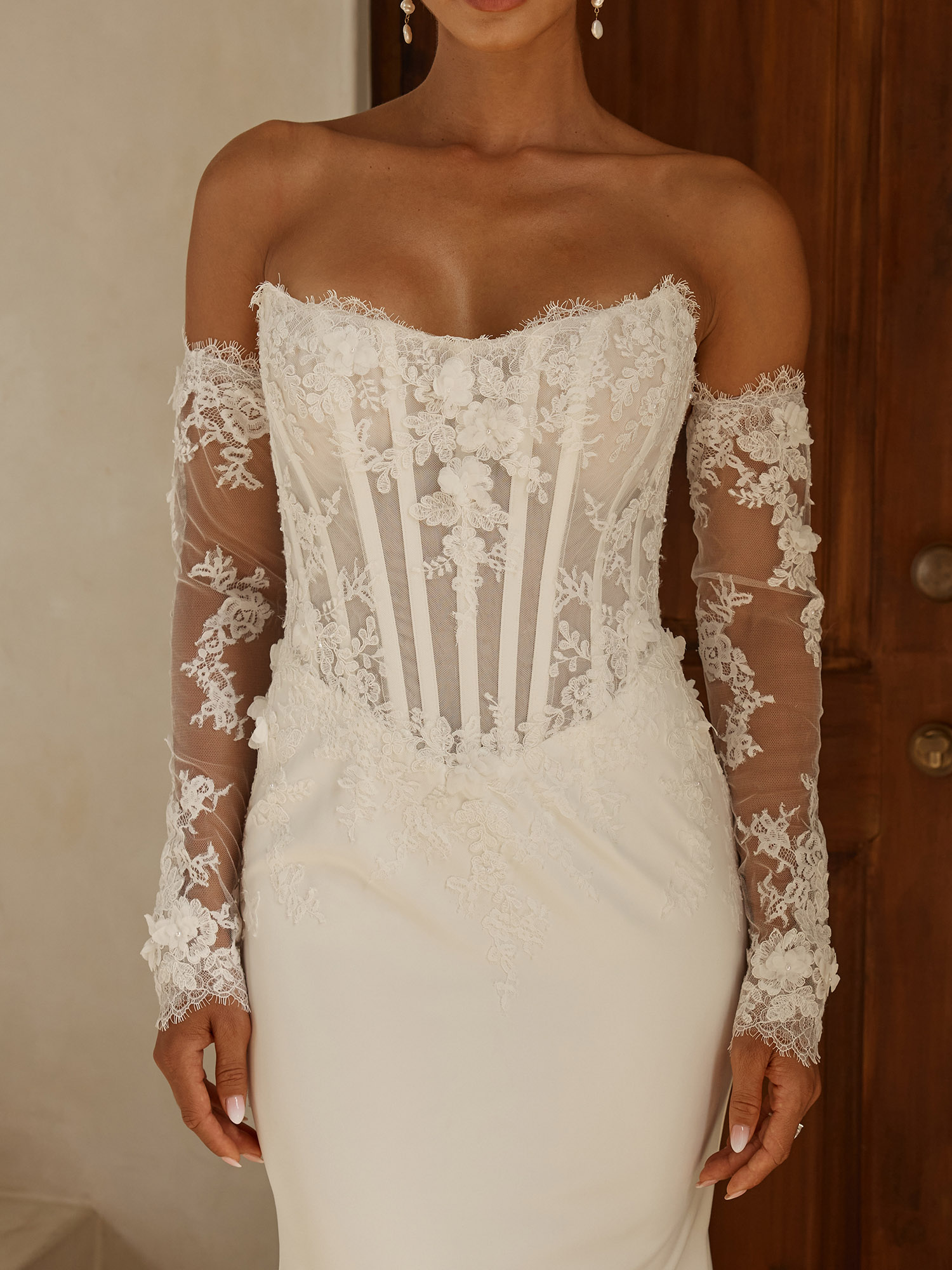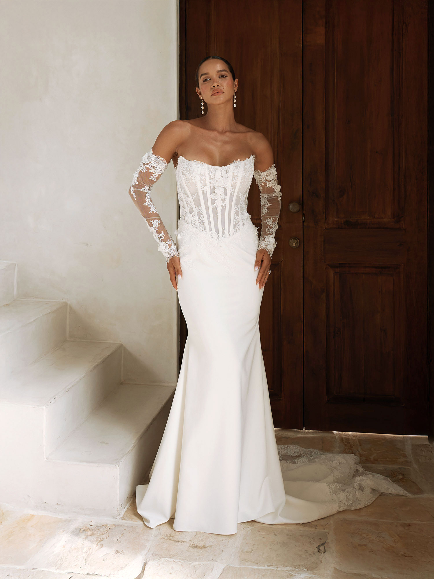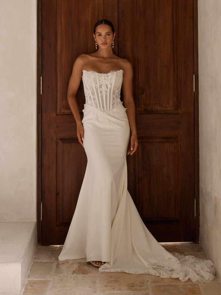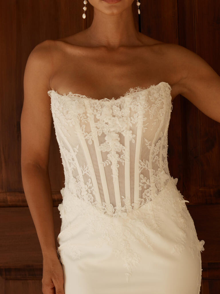 Composed of clean crepe and beaded Chantilly motifs, this look strikes a beautiful balance between soft glam and structural shape. All together creating an elevated, sensual design.