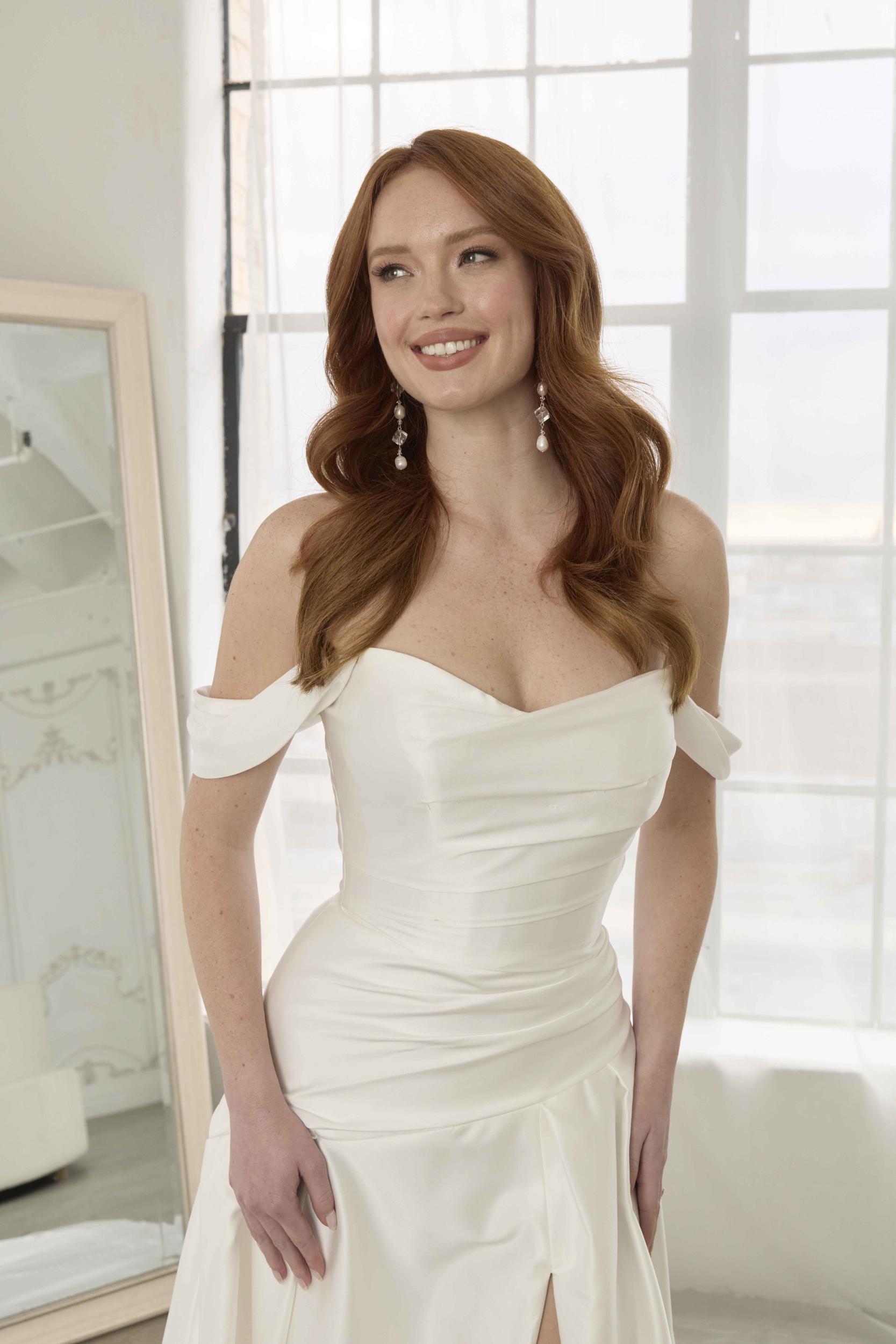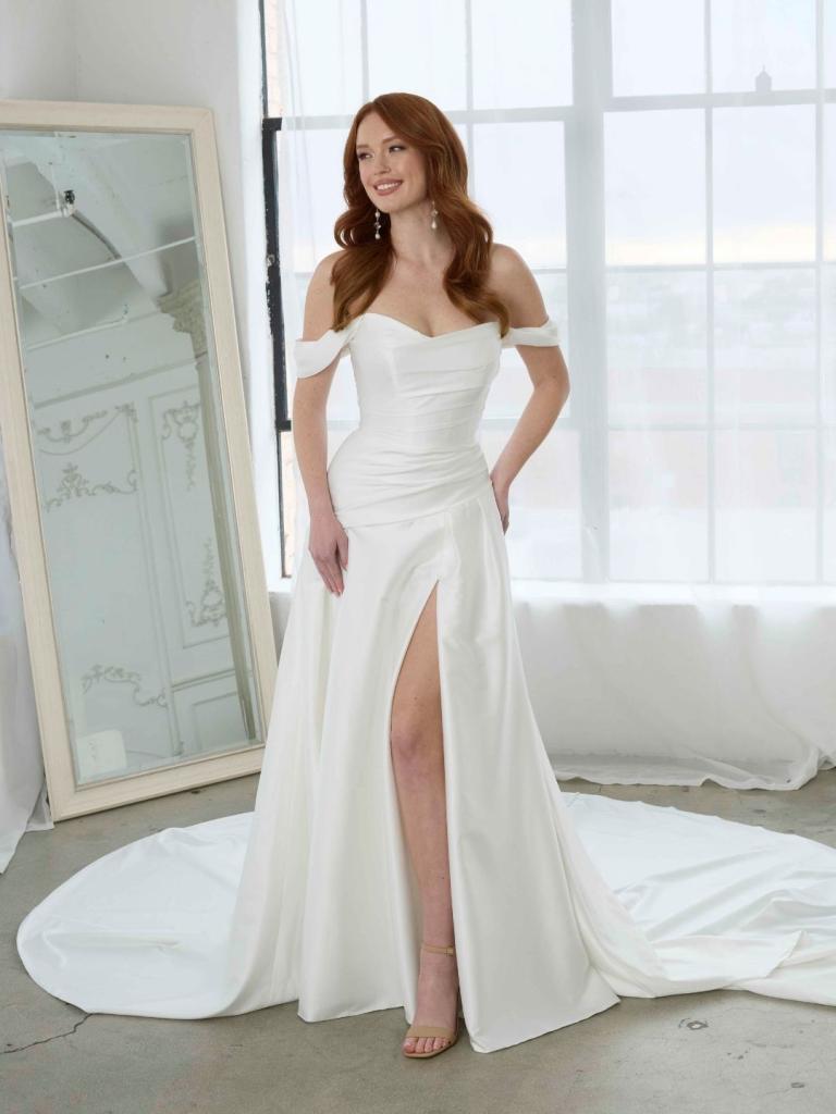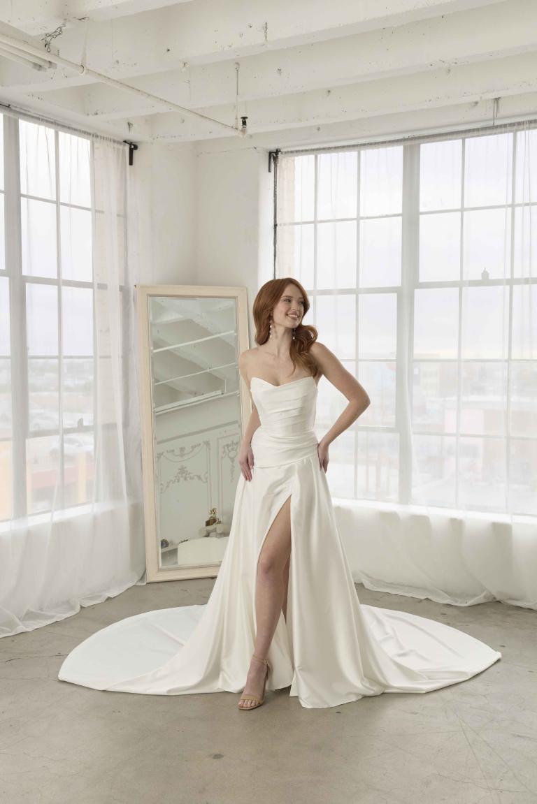 Lucas is a design crafted for the bride who embraces modern sophistication and understated elegance. Featuring a contemporary take on the classic drop waist style, this gown offers a flattering, functional silhouette with a touch of sensuality. The asymmetrical pleats draw in the waist and enhance the natural curves, while the deep V-neckline adds modern yet timeless appeal. The pleated skirt, with a soft leg split, creates a chic, structured look that can also be ordered without the split for a more streamlined appearance.