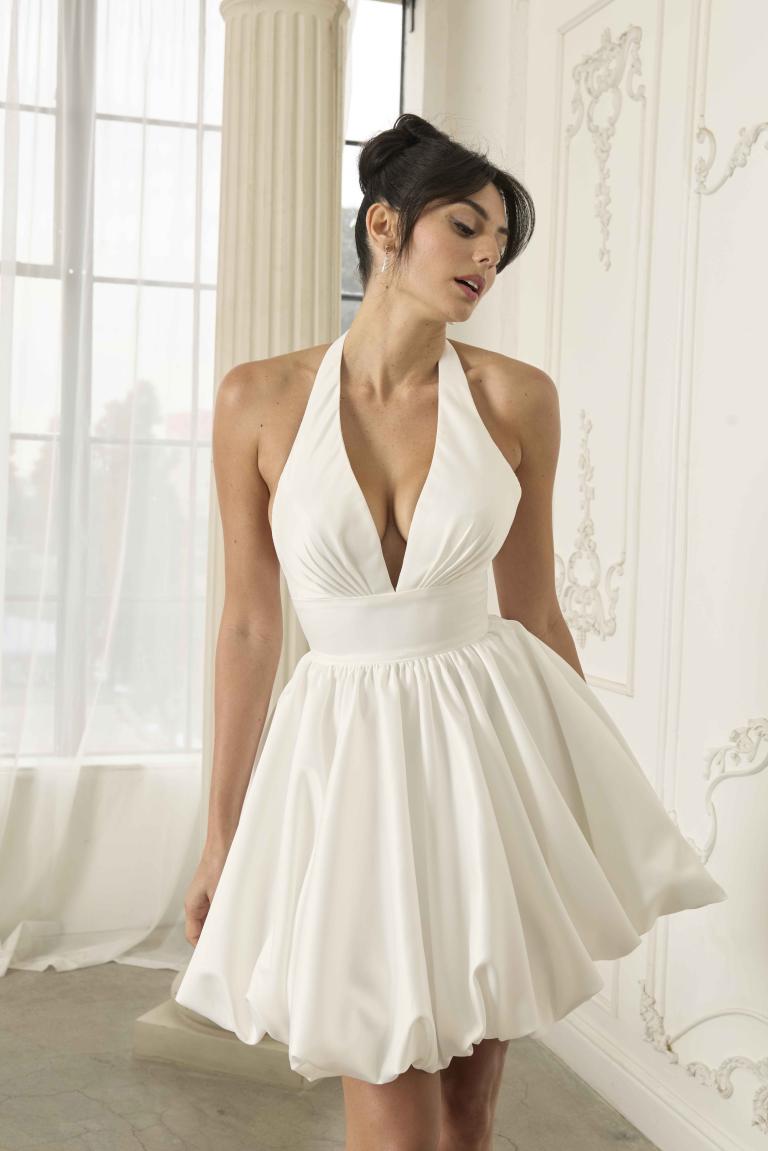 Luke is the perfect blend of sophistication and modern playfulness, designed for the bride seeking a chic and sexy reception dress or destination wedding look. Crafted from luxurious satin, Luke features a soft halter neckline and a boned bodice that flatters the figure while offering support and structure. The wide waistband cinches the waist, creating a flattering silhouette that emphasizes the bride’s natural shape. The skirt, with its trendy bubble design, adds a playful yet bold element to this contemporary gown, offering a fun and unexpected twist on classic bridal style.
