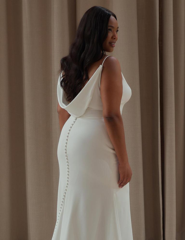 Elegant crepe gown with a detachable back cowl, perfect for the modern bride seeking refined simplicity and chic versatility.