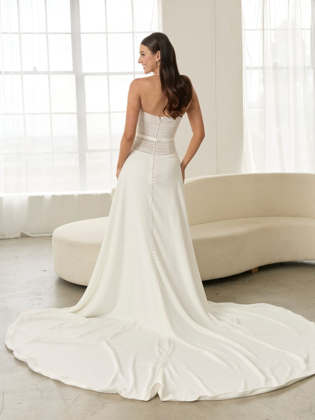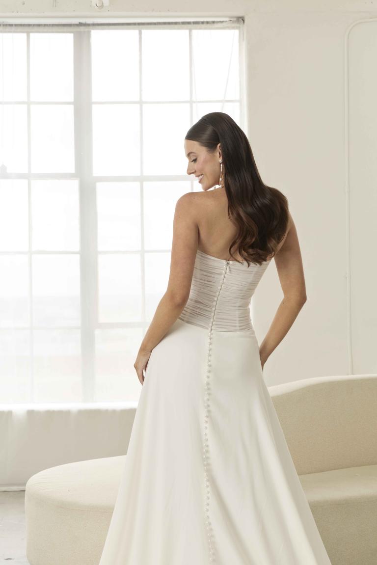 Inspired by separates but designed as an all-in-one gown, Owen provides the perfect balance of flexibility and elegance for the bride seeking a versatile design. The back is finished with a vertical row of buttons that add a delicate detail, and the detachable crepe belt highlights the natural waist, offering a personalized look. Owen is the perfect choice for brides who value understated elegance, modern details, and comfort without compromising on style.