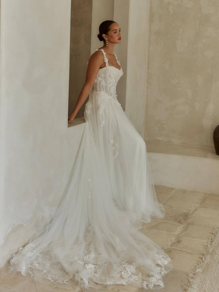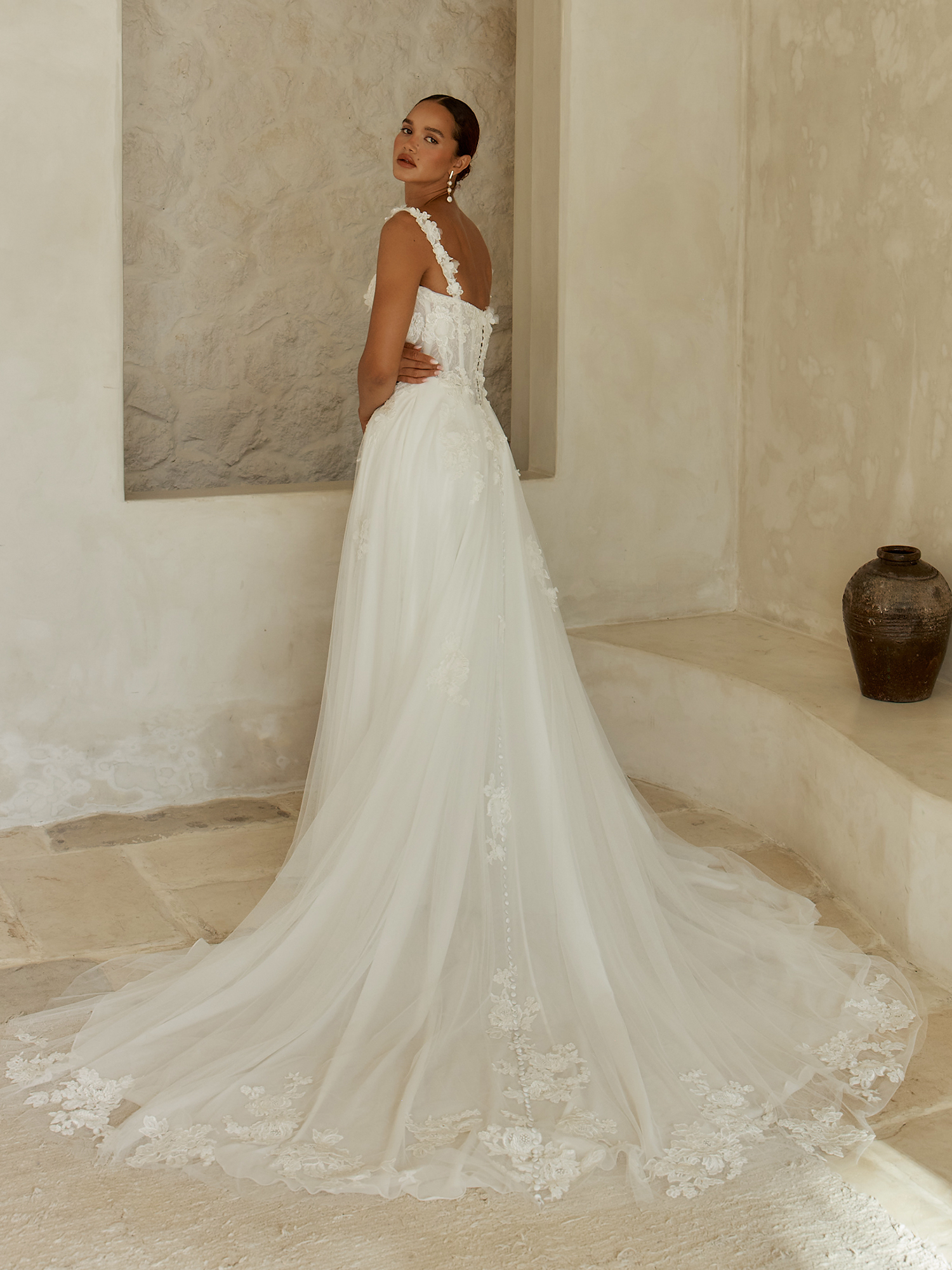 The skirt is scattered with matching motifs, creating dimension in the layers of the skirt. Through to the back, the simple tulle train that effortlessly fans out behind the bride. Framed by 3D florals that balance the look.