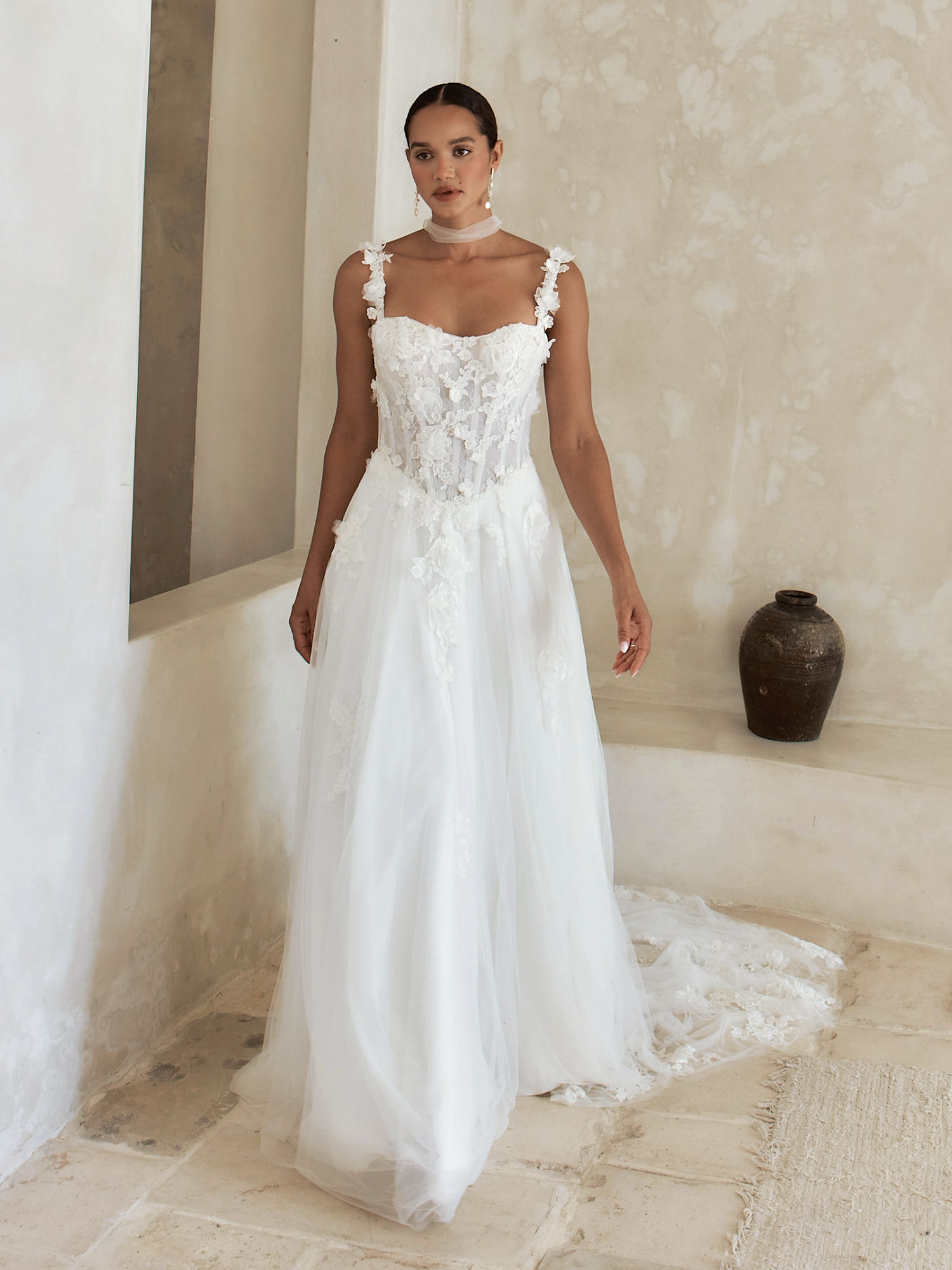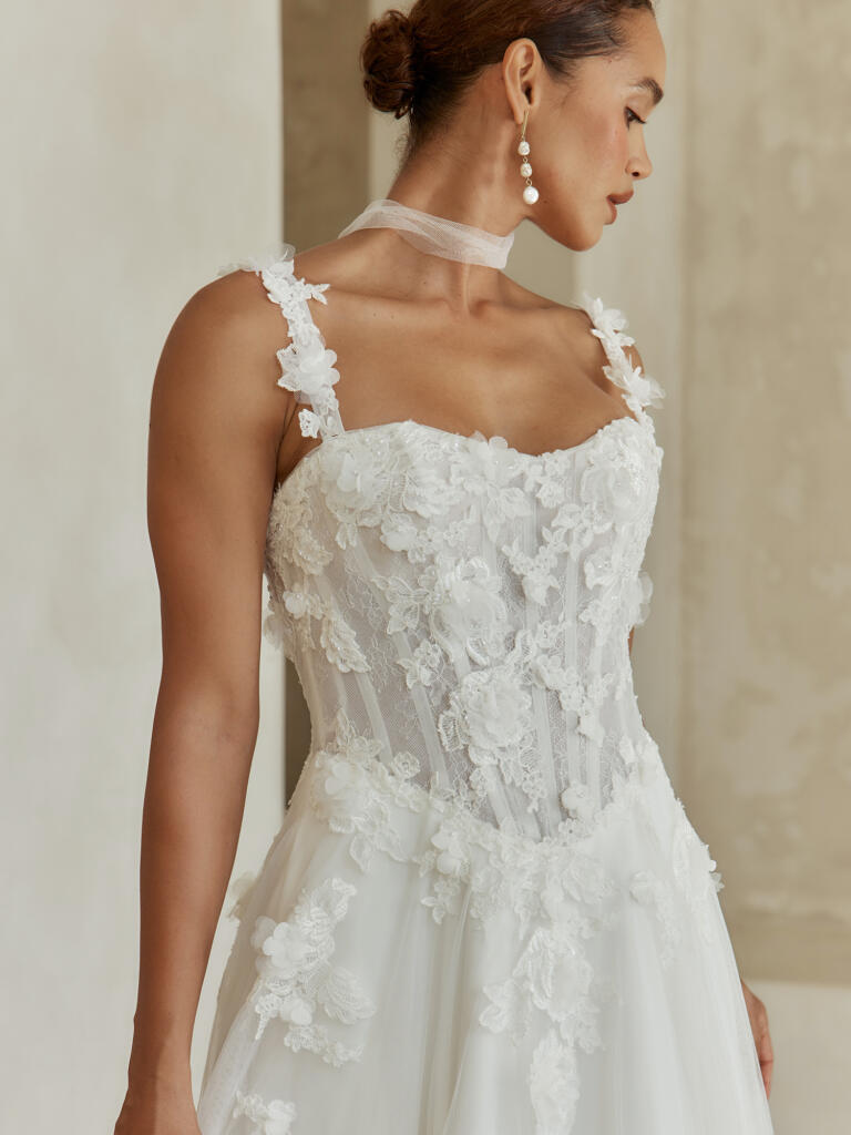 Layered under the decadent florals and sheer illusion lace, exposed corset-style boning adds structure to the bodice. A Basque waist creating a feminine shape before transitioning into the flowing A-line tulle skirt.