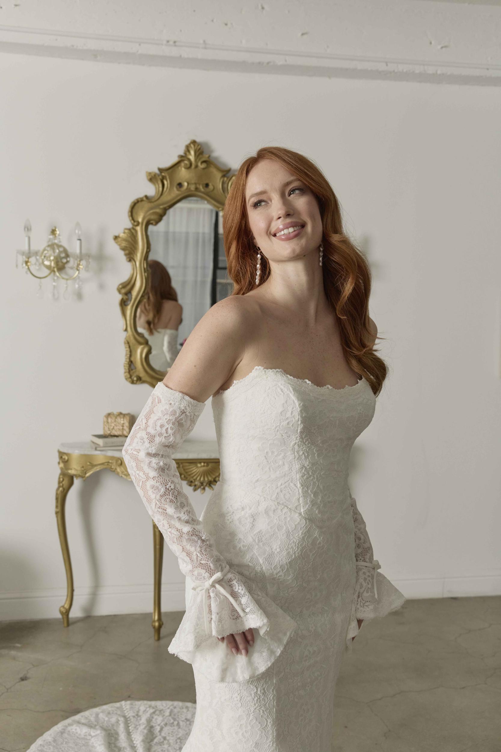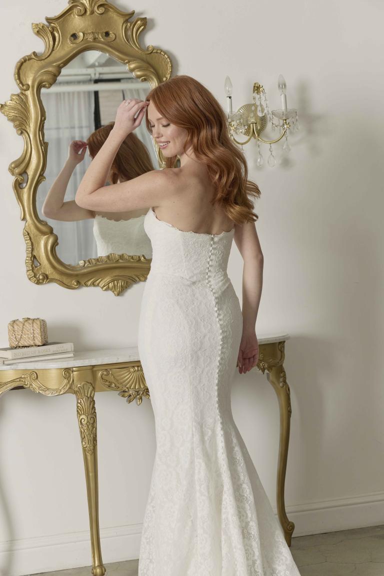 Look 1: For a clean and modern look, wear Rigby without the detachable sleeves to showcase the beautifully contoured bodice and lace detailing.