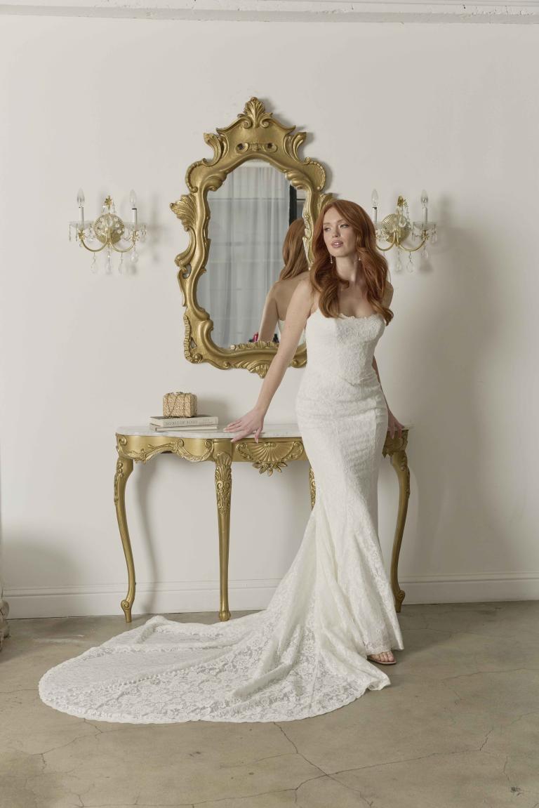 Rigby is the embodiment of romantic elegance, designed for the bride who adores lace and timeless beauty. Crafted from luxurious stretch lace, Rigby combines delicate lace trim and soft, feminine details for a look that’s both modern and sophisticated. The scoop neckline, framed with lace trim, adds a gentle touch of romance, while the basque waistline flatters the figure. The fit-and-flare skirt flows with grace, adorned with lace at the hem for a stunning finish. The V-back, with its pointed waistline, creates an elegant silhouette, while the illusion lace shaped train adds an enchanting touch.