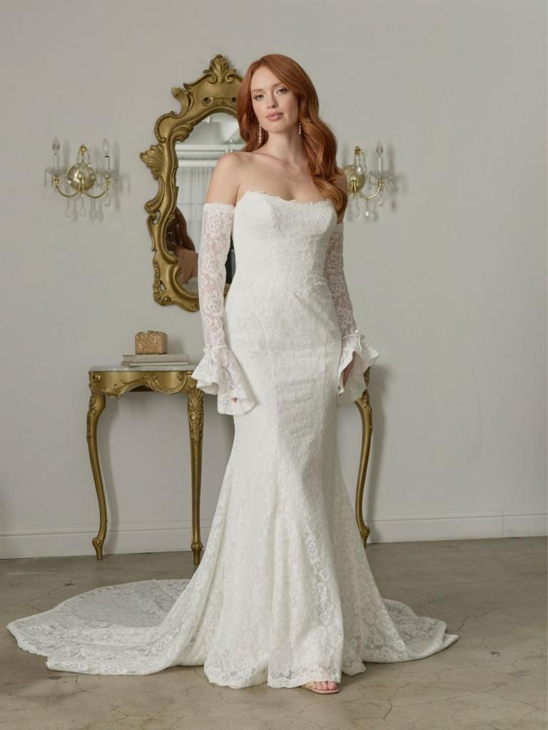 Look 2: Add drama and elegance with the detachable lace sleeves, creating a vintage-inspired, sophisticated look with a romantic touch.