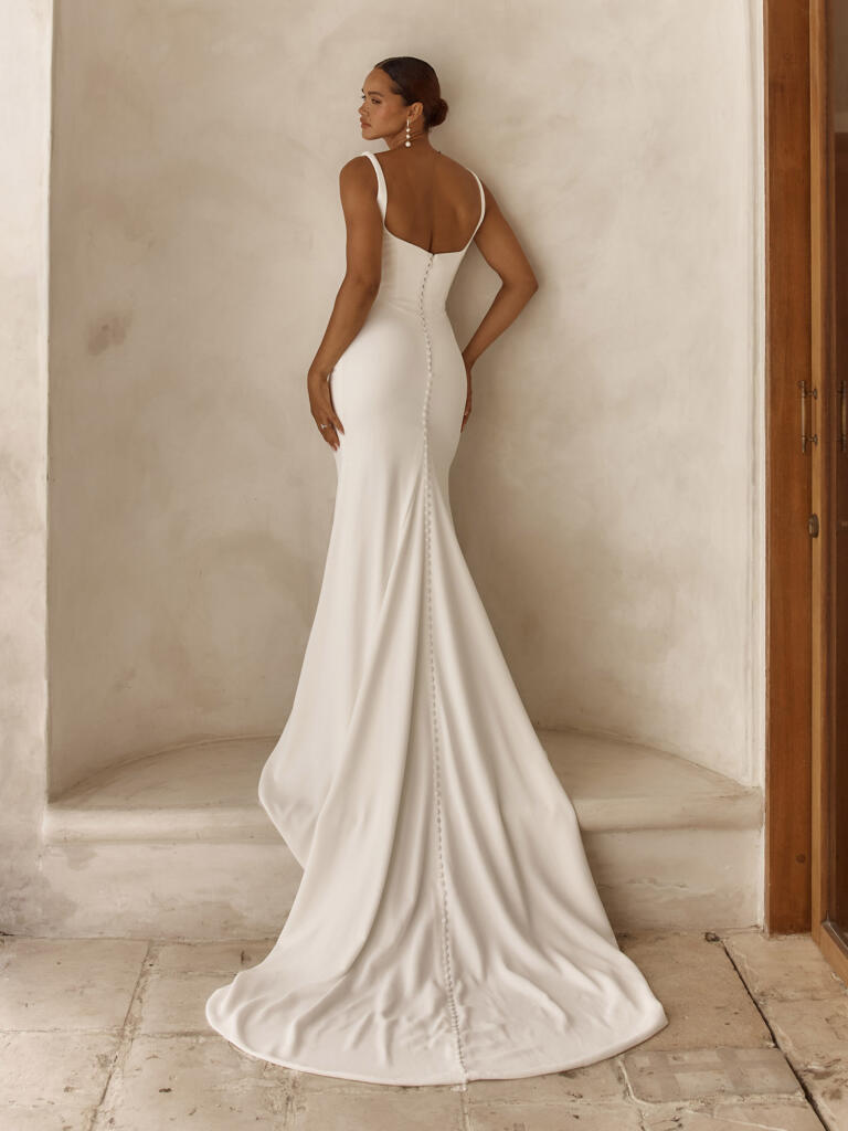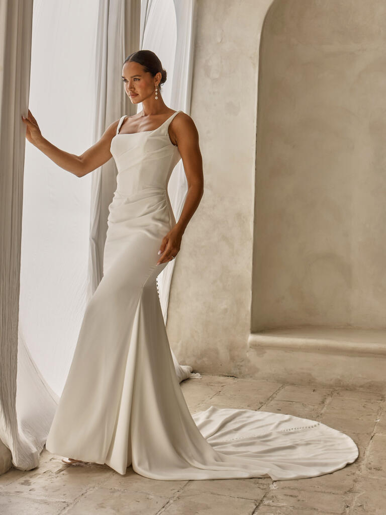 Our Simon wedding dress is chic, classic, clean and so much more. Crafted in sleek crepe fabric and acting as the perfect minimalist bridal look.