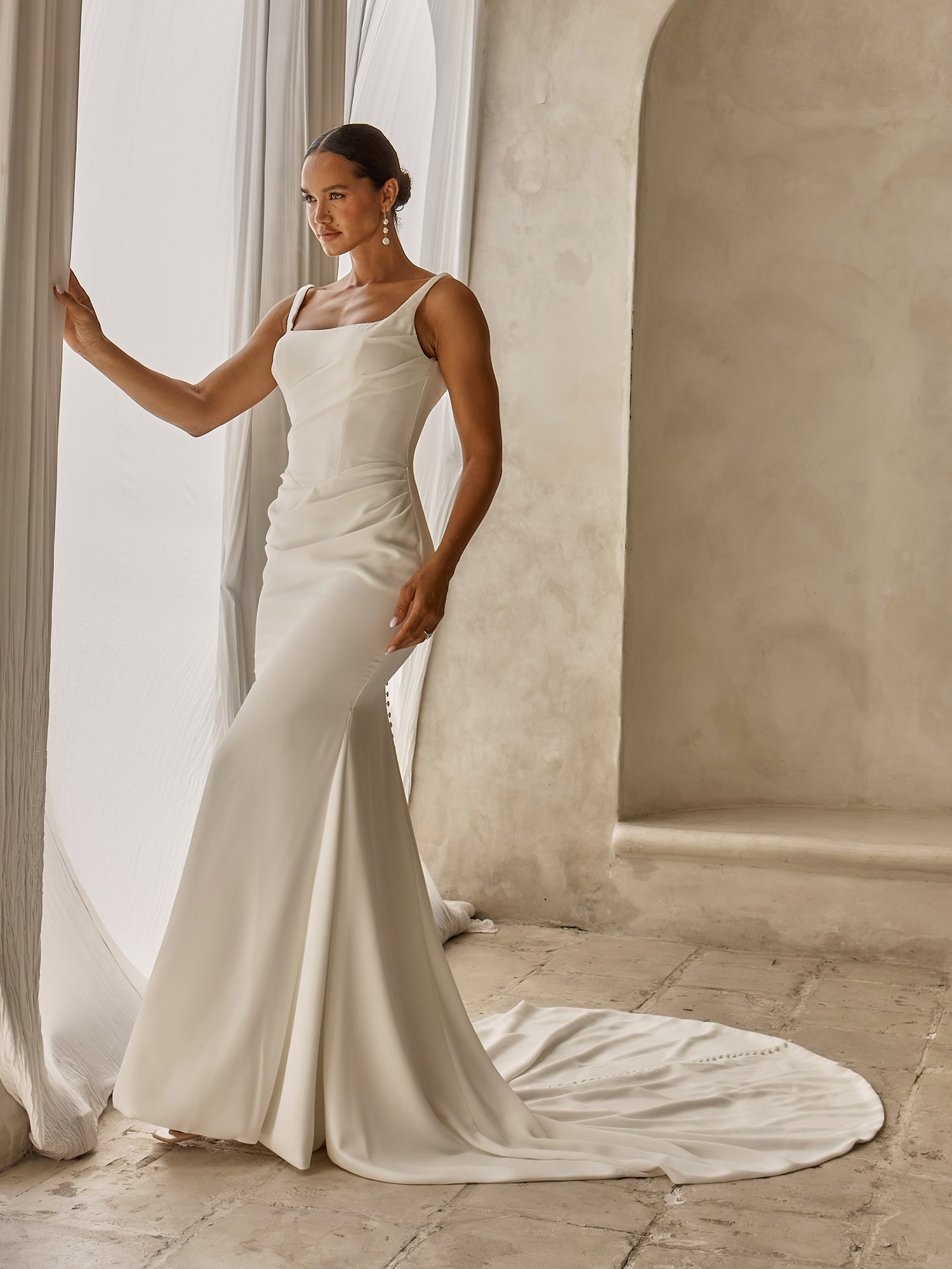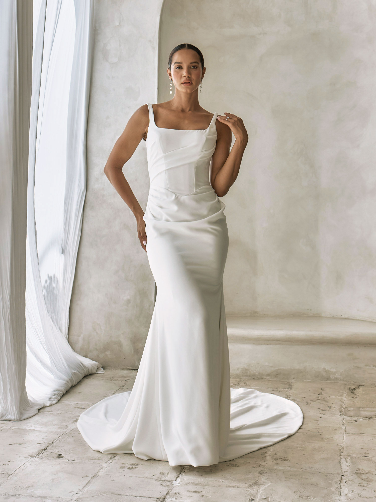 A modern and modest square neckline and shoulder straps frames the decolletage. Asymmetric pleated details travelling through the bodice and into the skirt around the hips. This draped-look detail adding movement in the streamlined look, while subtly shaping the figure to celebrate the body’s natural curves. Boned for structure through the bodice and support.