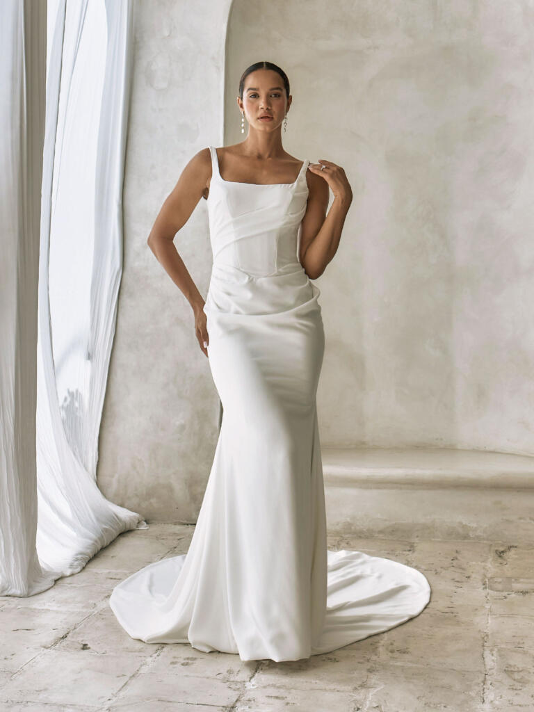 The square back bodice feels supportive and modern, giving the look elegance from every angle.