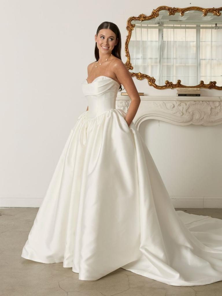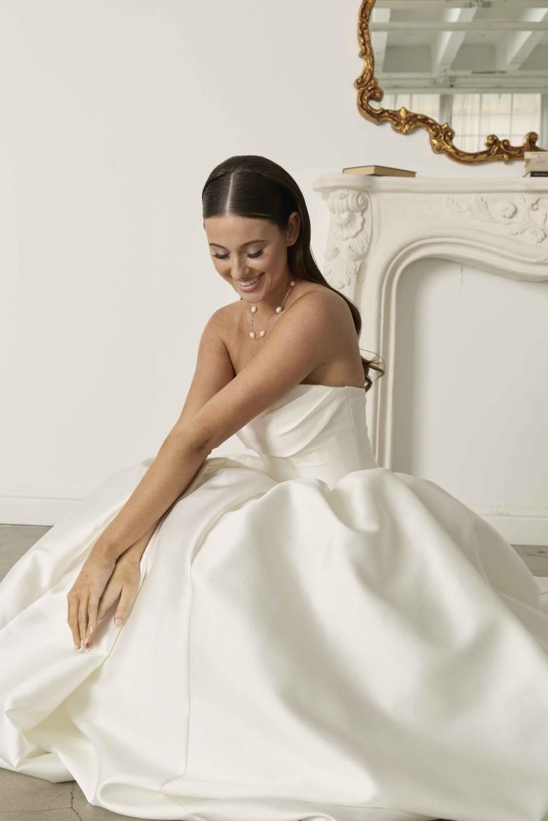 Theo is designed for the bride who radiates timeless elegance with a modern edge. Crafted from luxurious Mikado fabric, this gown combines classic bridal beauty with contemporary sophistication. The strapless sweetheart neckline is elegantly draped, creating a soft yet structured look that flatters the décolletage. The princess seams and Basque waistline elongate the silhouette, while the gathered Mikado ballgown skirt adds dramatic volume. The pointed V back waistline, finished with a row of buttons, adds a refined touch, while the dramatic train completes the bridal statement.