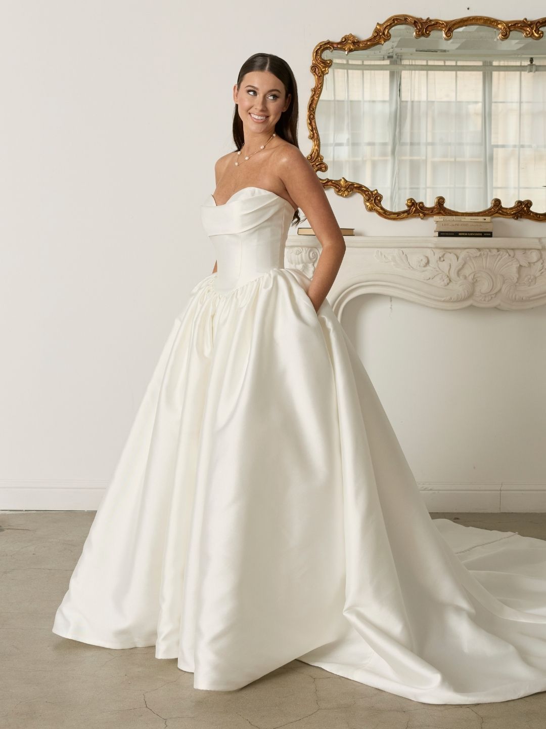Theo is the perfect gown for brides who want both modern style and traditional elegance. Whether you’re envisioning a classic, chic, or fairytale-inspired wedding, Theo is versatile enough to suit any style. With its draped overlay, Basque waistline, and Mikado fabric, Theo is an iconic choice for the bride seeking elegance with a contemporary flair.